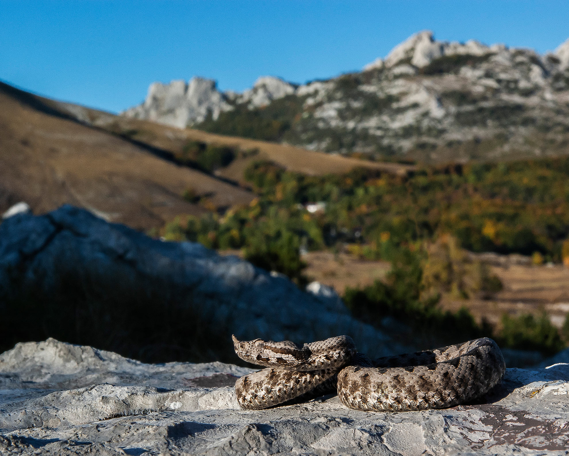 Nose-horned Viper (poskok) in Velebit, Croatia it is reputed to be the most dangerous of the European vipers due to its large size, long fangs (up to 13 mm) and high venom toxicity.
